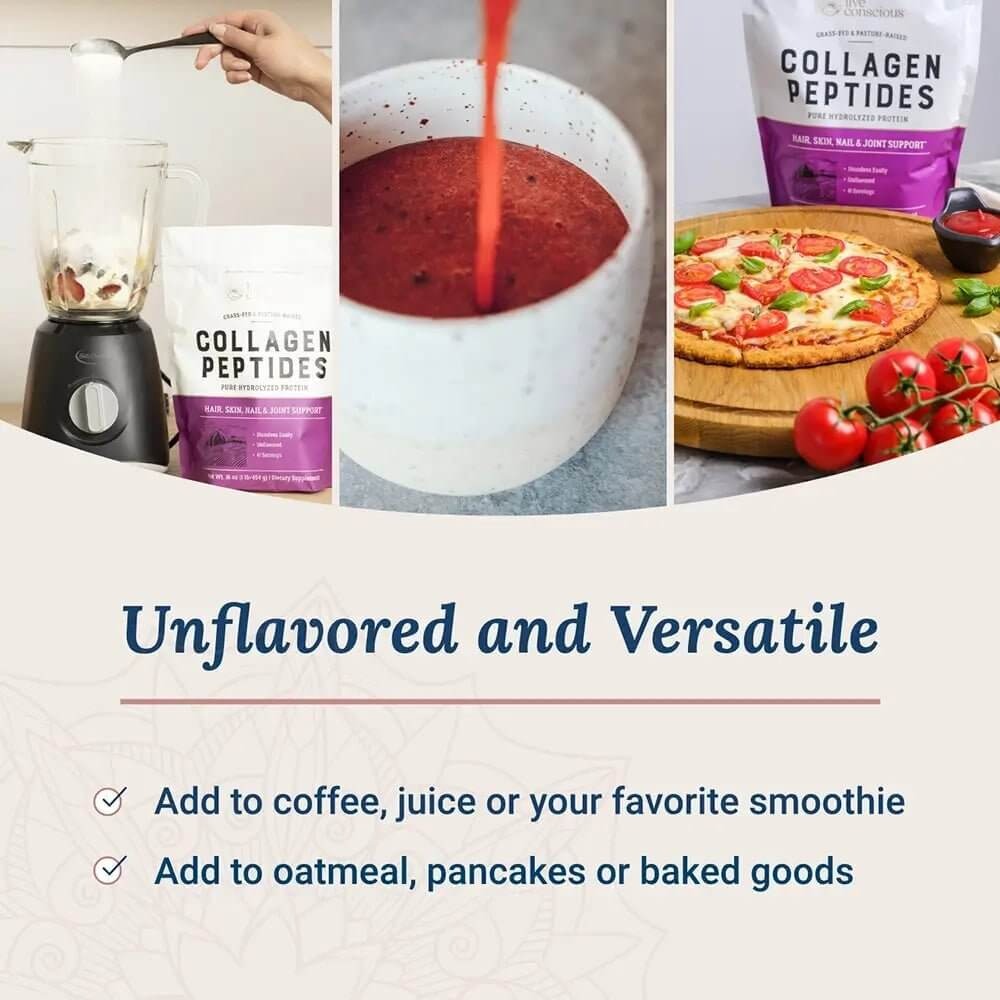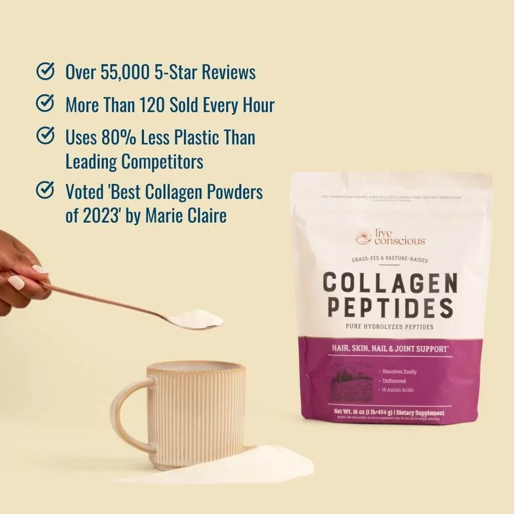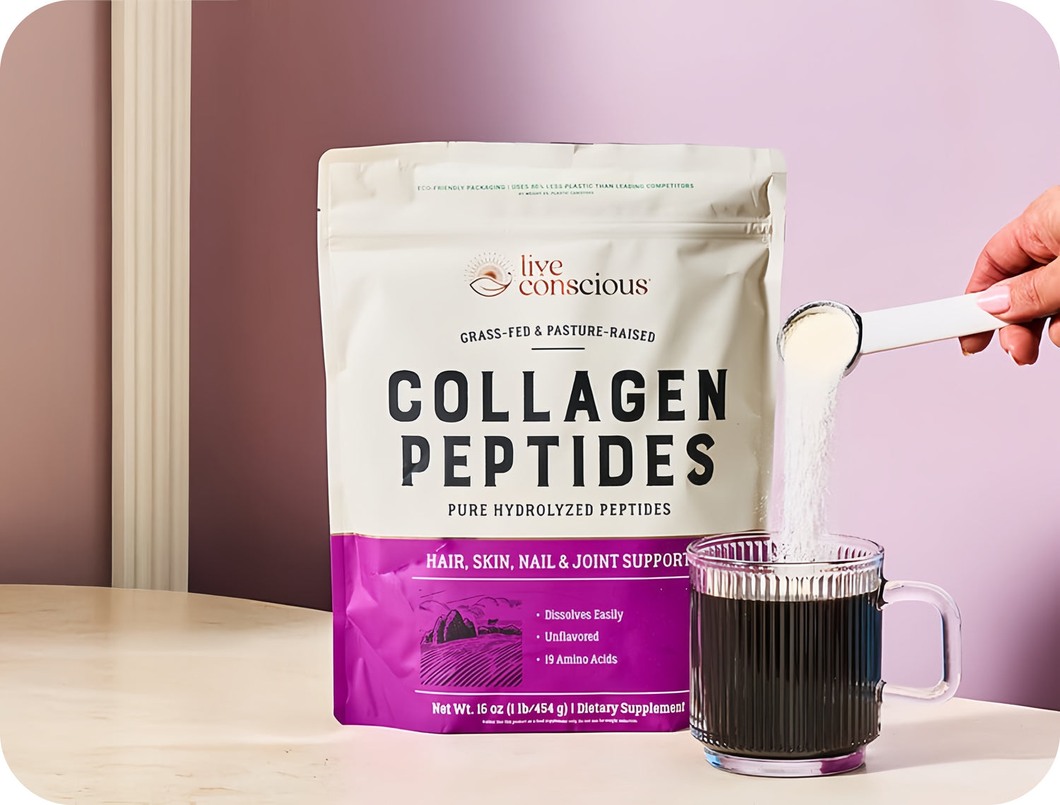 Live Conscious® hydrolyzed types I & III Collagen Peptides powder is sourced from grass-fed, pasture-raised bovine and is hormone-free and 100% non-GMO.